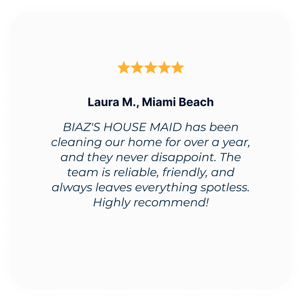 For over four and a half years, BIAZ’S HOUSE MAID has proudly served homes and businesses across Miami, Miami Beach, Sunny Isles, Golden Beach, Hallandale, and Dania Beach.